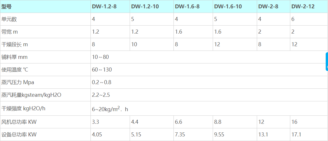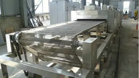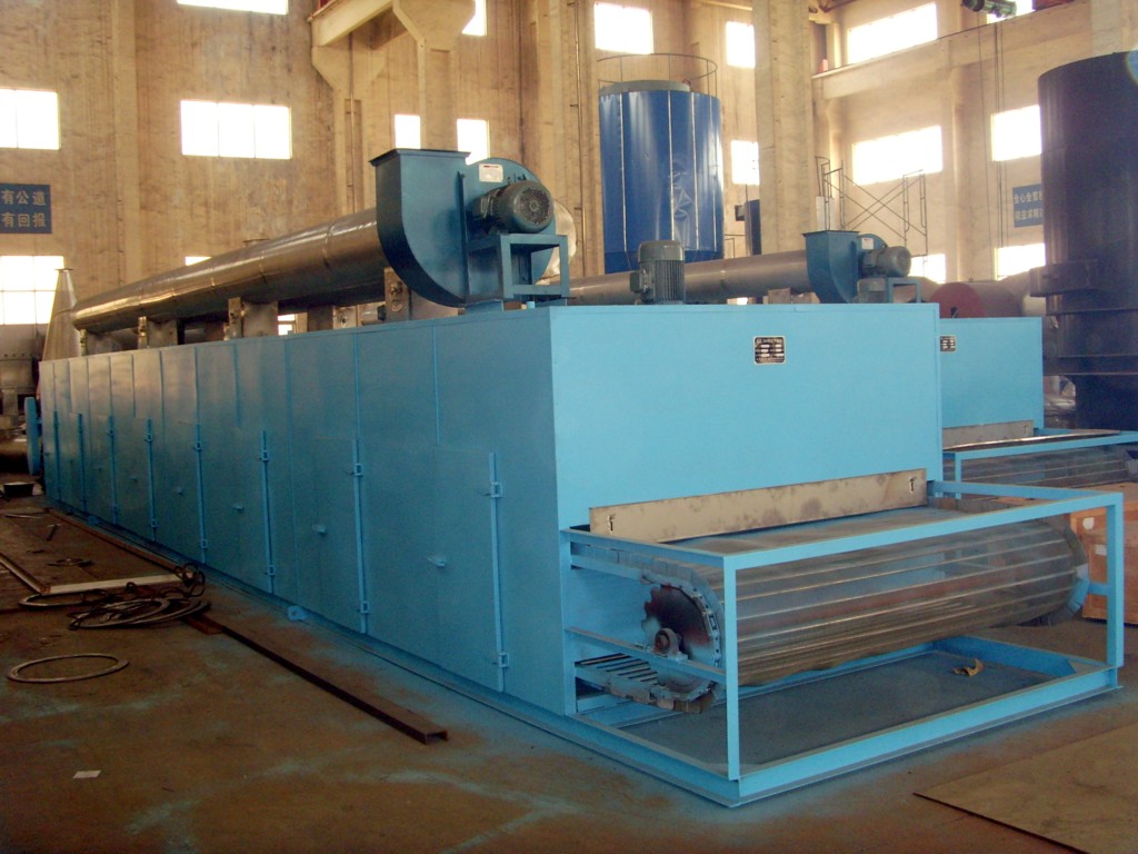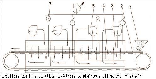 物料由加料器均匀地铺在网带上,网带一般采用12-60目不锈钢丝网,由传动装置拖动在干燥机内移动。干燥机由若干单元组成,每一单元热风独立循环,部分尾气由专门排湿风机排出,废气由调节阀控制,热气由下往上或由上往下穿过铺满物料的网带完成热量与质量传递的进程,带走物料水份。网带缓慢移动,运行速度可根据物料温度自由调节,干燥后的成品连续落入收料器中。上下循环单元根据用户需要可灵活配备,单元数量亦可根据需要选取。