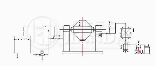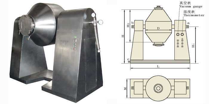 双锥回转真空干燥机为双锥形的回转罐体,罐内在真空状态下,向夹套内通入蒸汽或热水进行加热,热量通过罐体内壁与湿物料接触,湿物料吸热后蒸发的水汽,通过真空泵经真空排气管被抽走。由于罐体内处于真空状态,且罐体的回转使物料不断的上下内外翻动,故加快了物料的干燥速度,提高干燥效率,达到均匀干燥的目的。