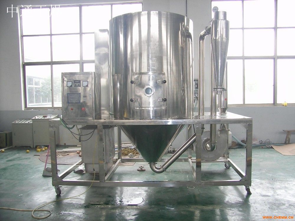 空气经过过滤和加热,进入干燥器顶部空气分配器,热空气呈螺旋状均匀地进入干燥室。料液经塔体顶部的高速离心雾化器,(旋转)喷雾成极细微的雾状液珠,与热空气并流接触,在极短的时间内可干燥为成品。成品连续地由干燥塔底部和旋风分离器中输出,废气由风机排空。